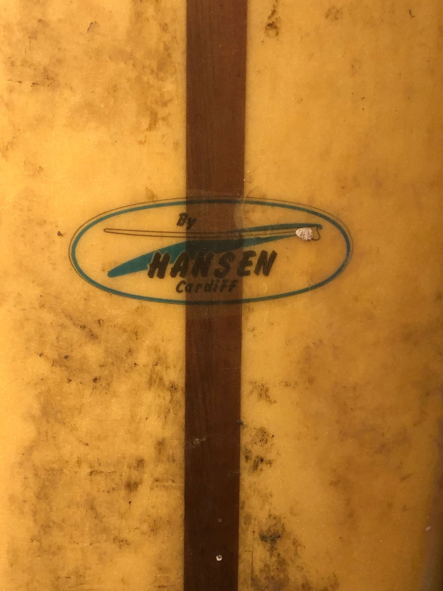 ‘Pacific System Homes’ Style Redwood/Balsa Plank 10’ 7-1/2” 22-1/2” wide 17-1/2” nose 19” tail 3-1/2” thick 49 lbs. The board may have been shortened somewhat by cutting off the tail. “Dick purchased this…